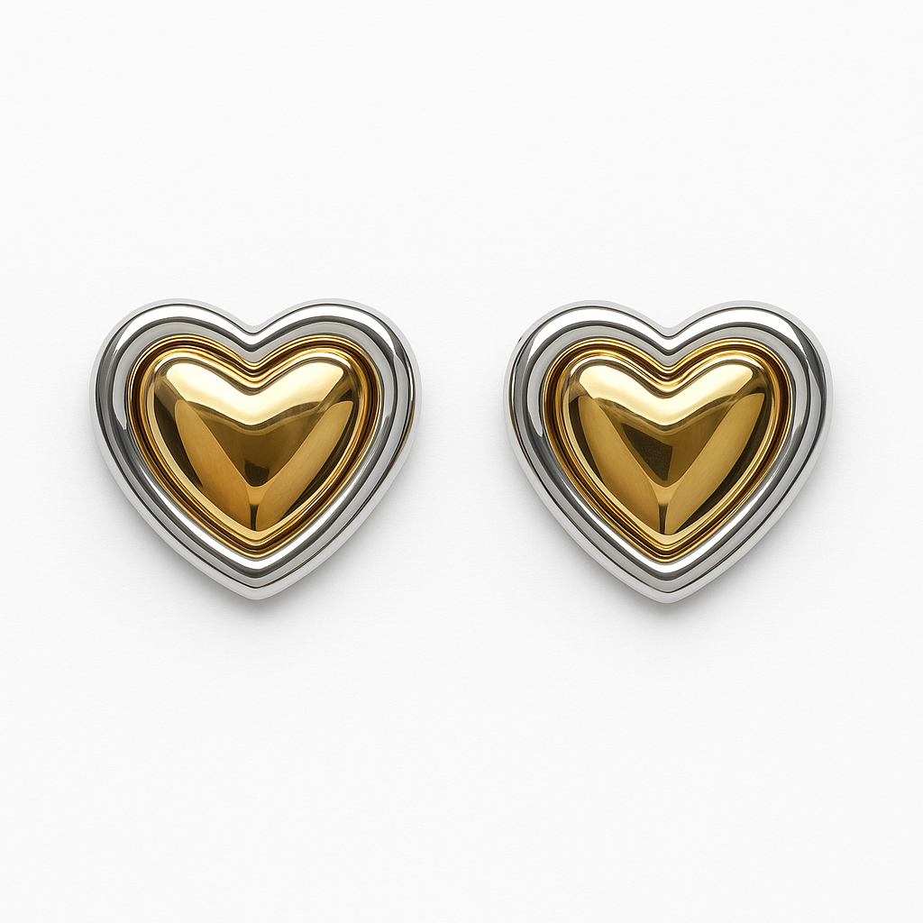 Con la loro forma a cuore bombato e la finitura specchiata bicolor oro e argento, gli Amour reinterpretano il classico simbolo dell’amore in chiave contemporanea. Grintosi ma dolci, sono ideali per completare ogni look con personalità.
