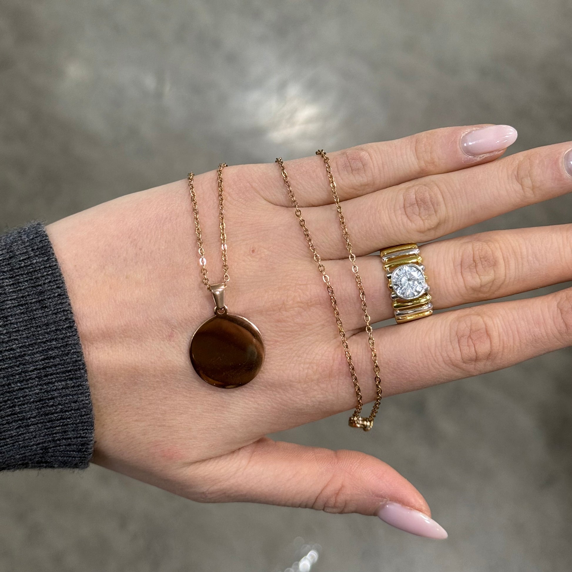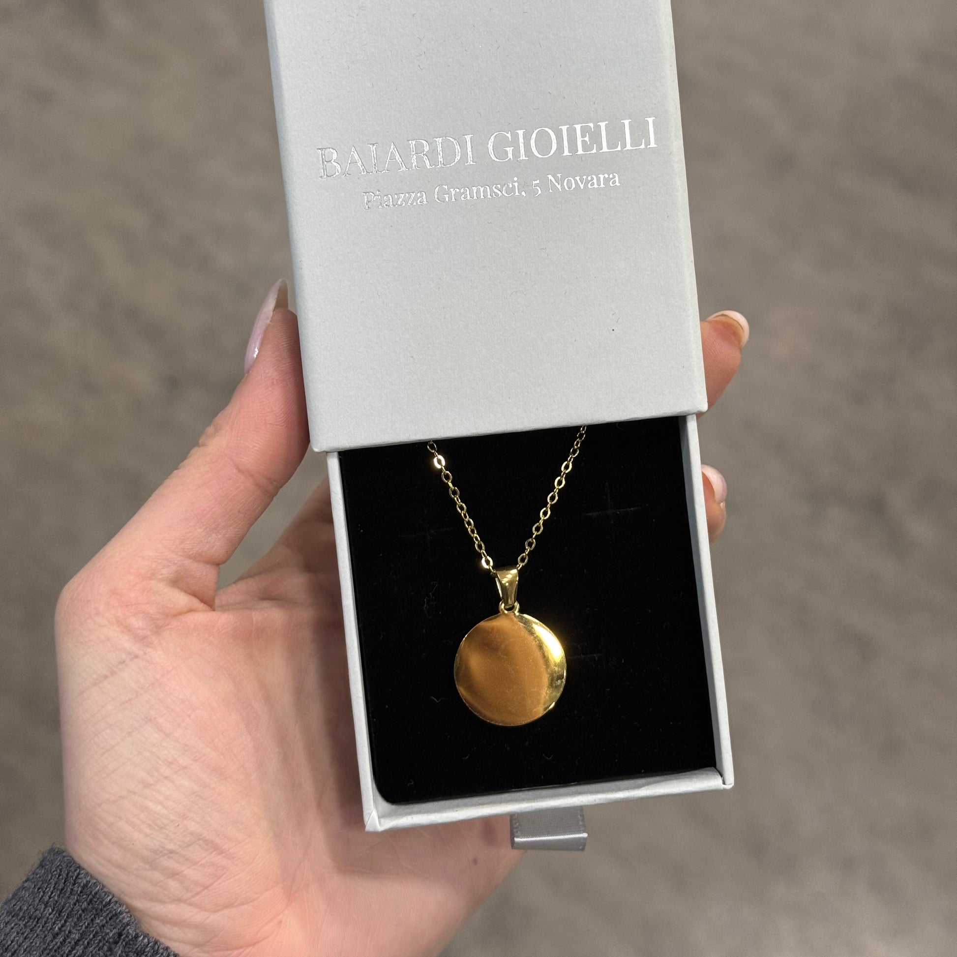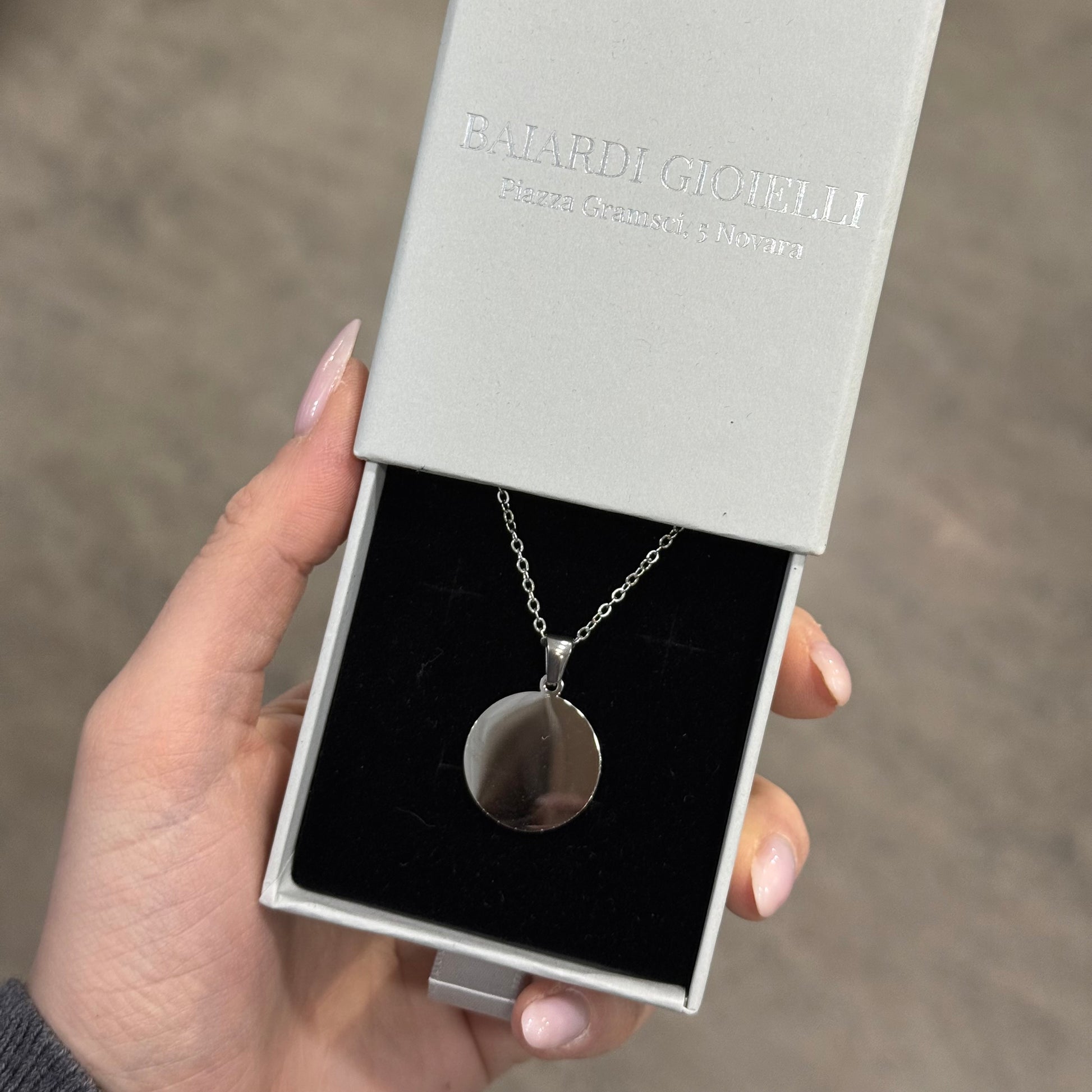 Collana in acciaio, forma rotonda con catena abbinata, superficie liscia indicata per l’incisione.