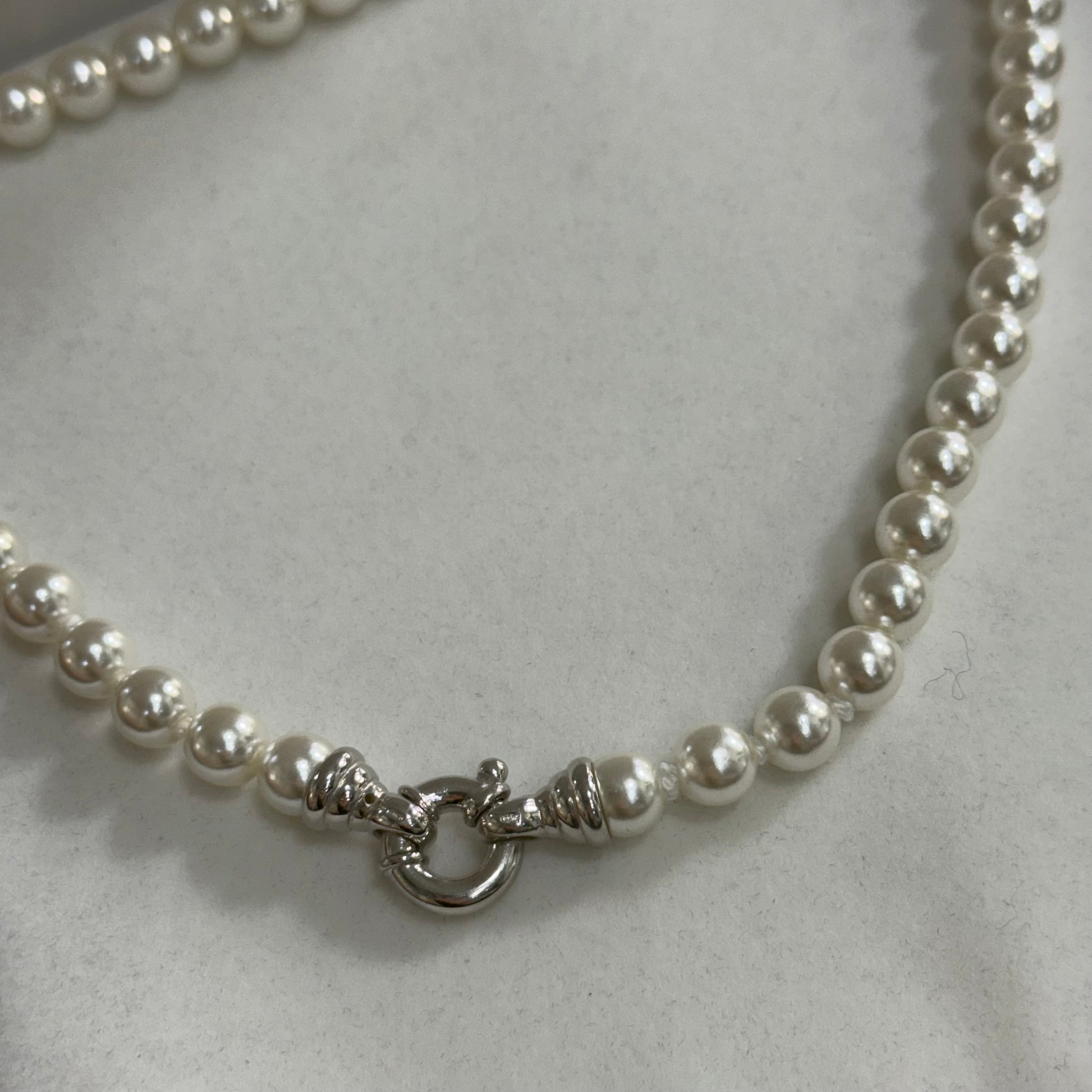 Collana in perle di Mallorca color Argento e chiusura in Argento 925, infilata a nodi