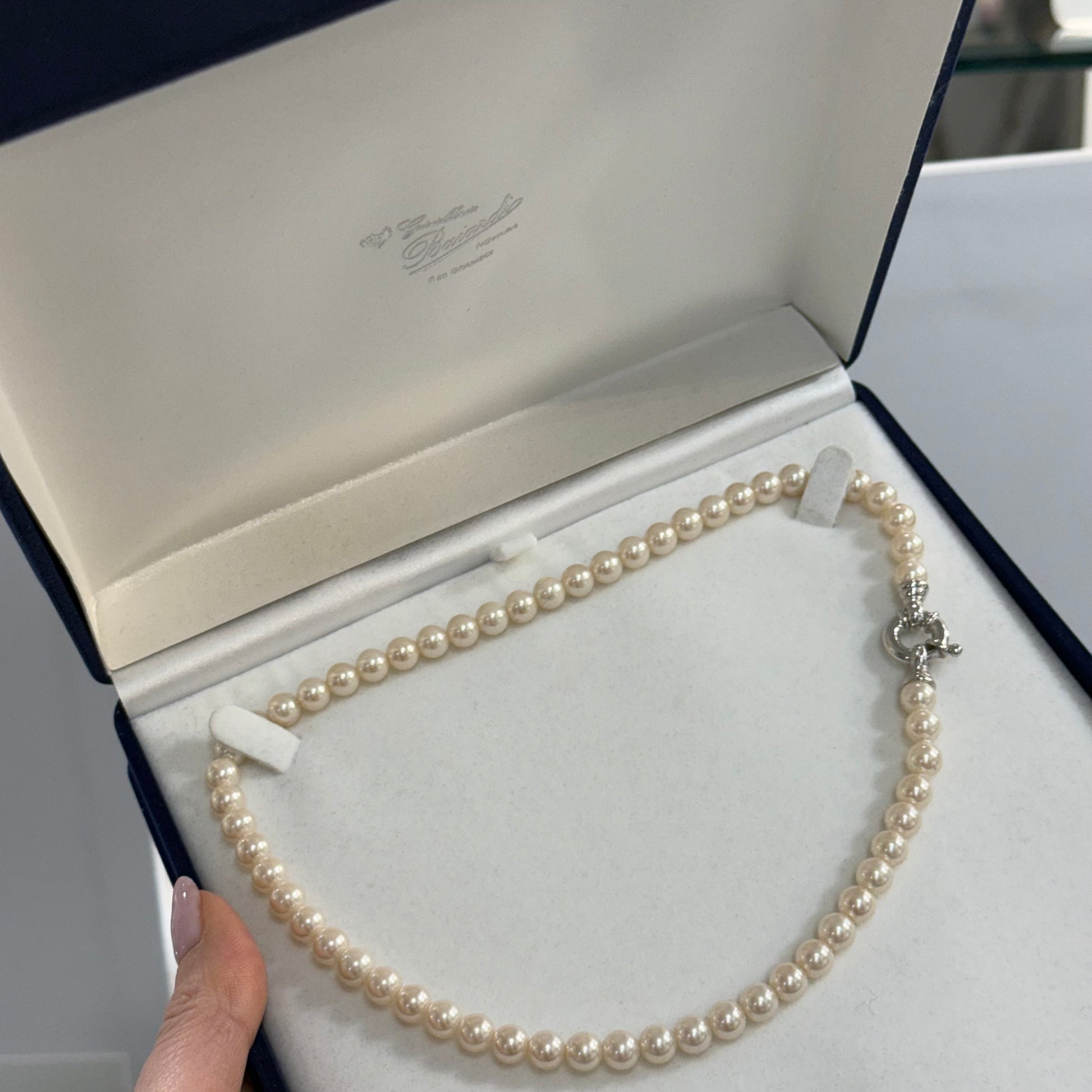 Collana in perle di Mallorca color Gold e chiusura in Argento 925, infilata a nodi