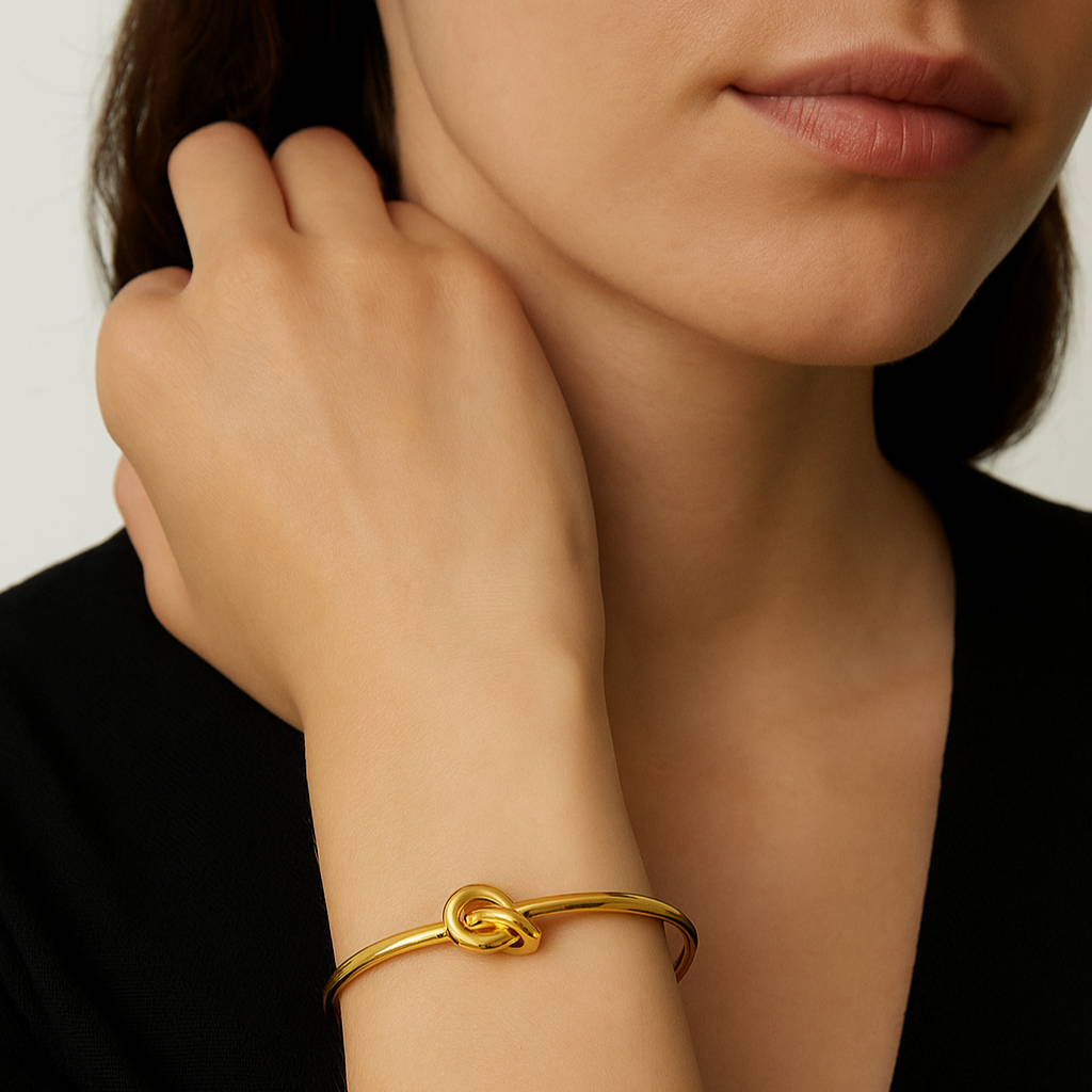 Con il suo nodo centrale e la linea sottile e pulita, questo bracciale rigido rappresenta un legame eterno. Essenziale e versatile, è ideale da indossare ogni giorno, da solo o abbinato ad altri bracciali. Disponibile nelle varianti oro e argento.