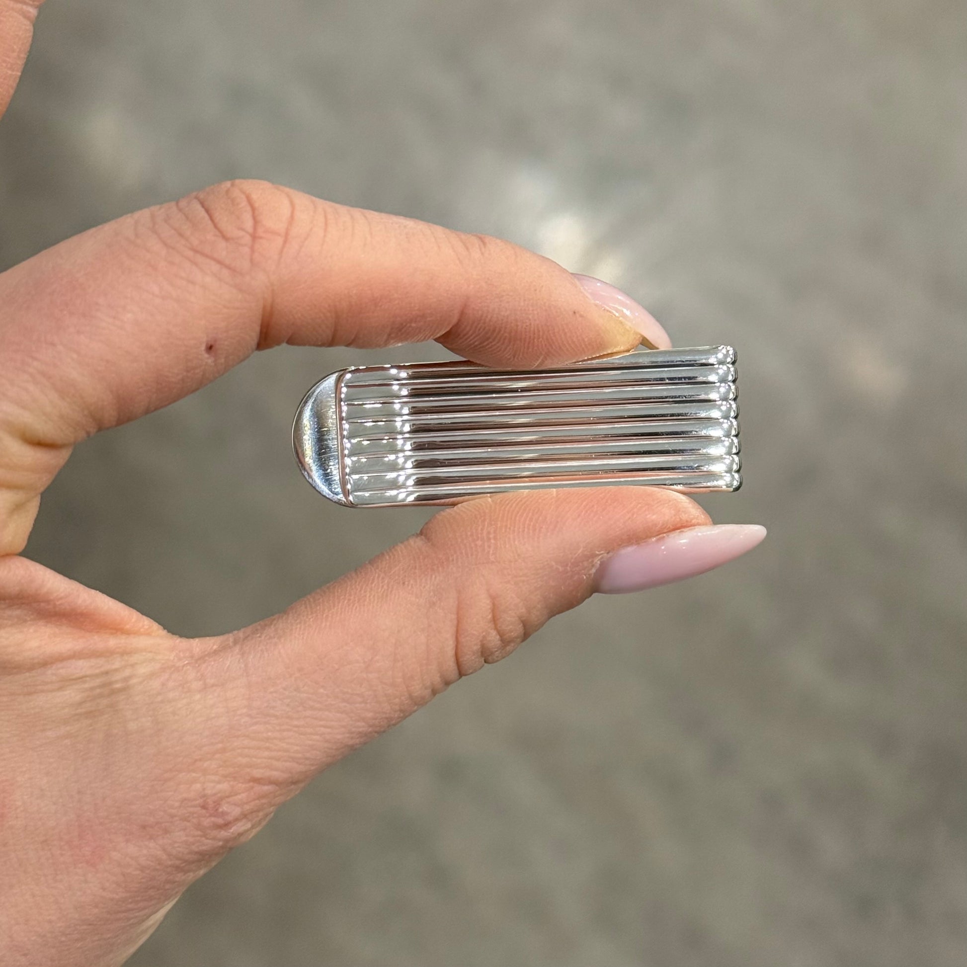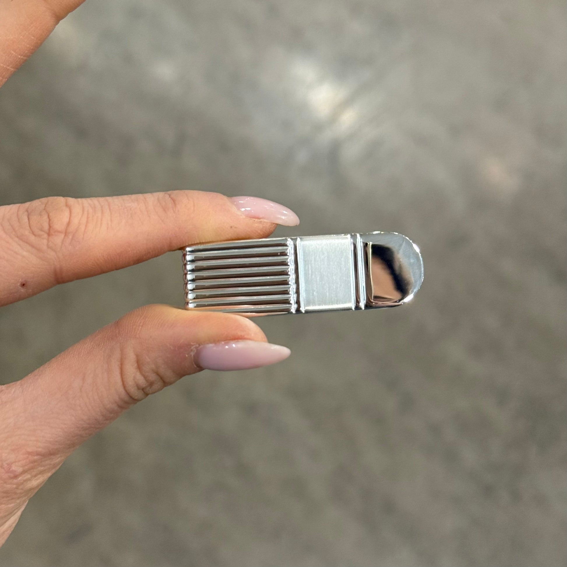 Fermasoldi in argento 925, creato in fusione e pieno, molto resistente dal motivo elegante ispirato alla stile presidenziale che alterna dettagli lisci a dettagli satinati. Possibilità di personalizzarlo con un numero, una data, le inziali.
