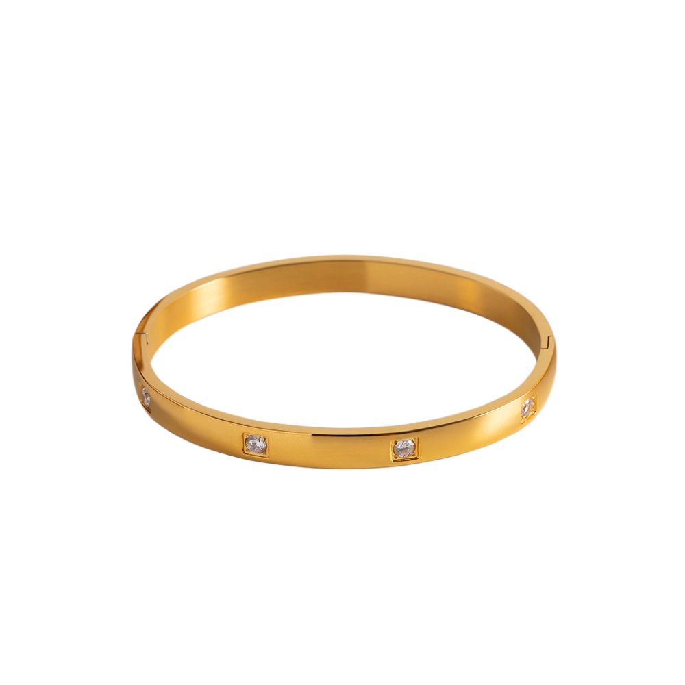 Bracciale rigido in acciaio, con delicati zirconi incastonati lungo il profilo, perfetto da indossare ogni giorno per aggiungere luce a ogni gesto. Raffinato da solo, elegante in abbinamento ad altri bangles. Disponibile in versione oro e argento.